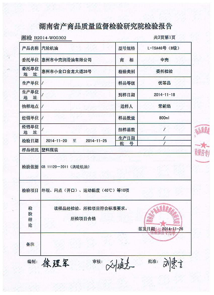 中壳润滑油有限公司通过湖南省技术监督局检测